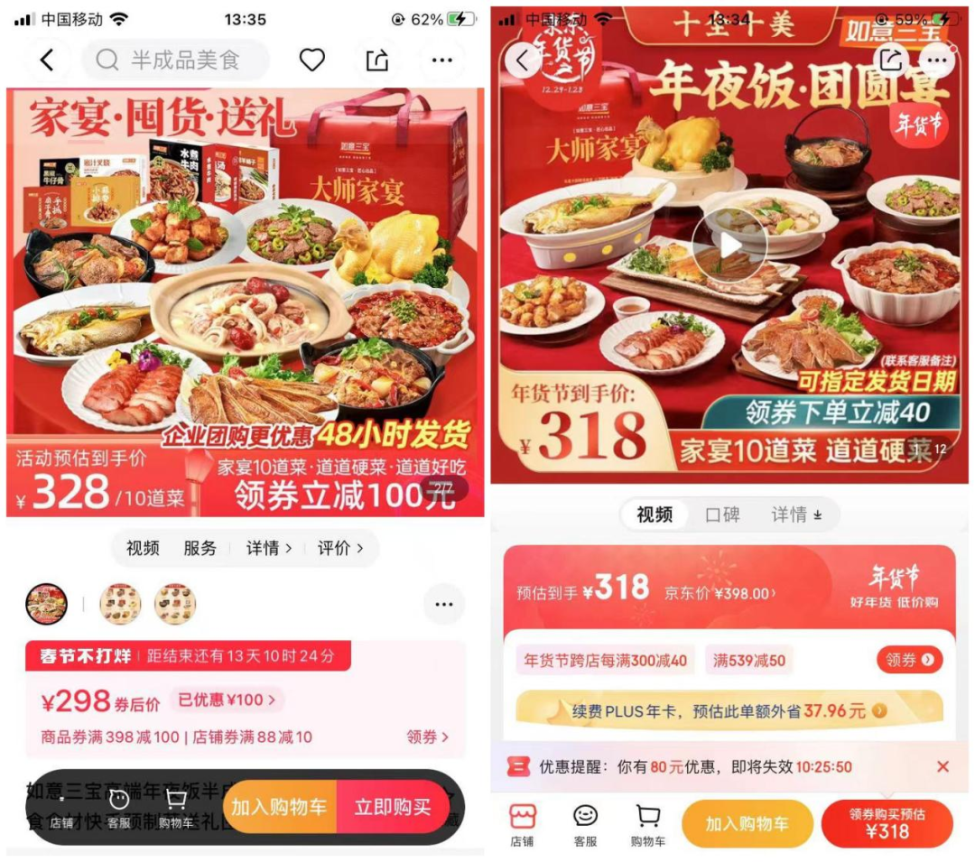 如如意三宝年夜饭半成品菜套餐在京东和天猫的最终价格几乎都是300元左右。换句话说,在产品趋同的情况下,比拼价格成为电商平台抢夺客户的主要方式。