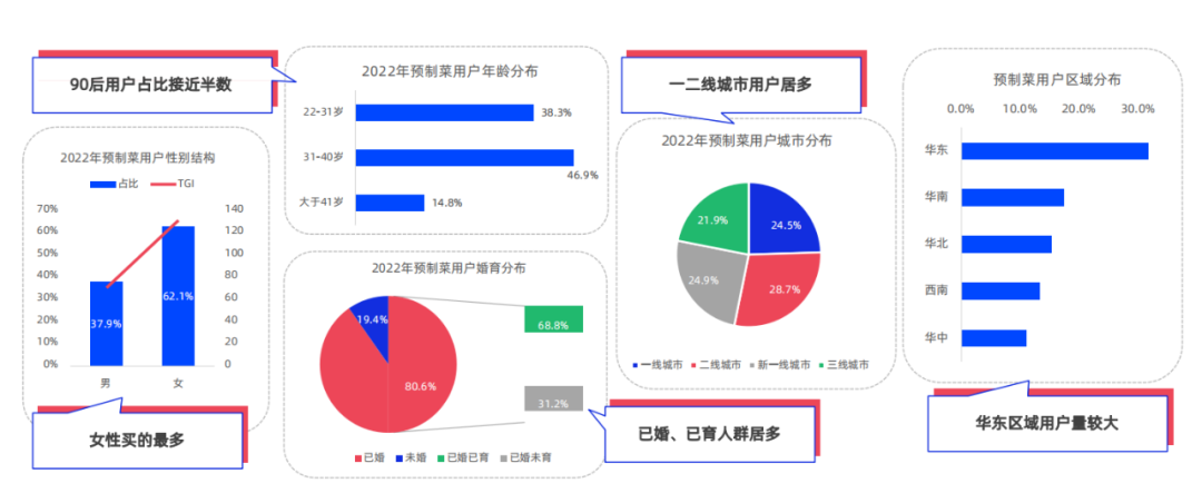 对标预制菜的用户群体我们就不难看出,目前年夜饭的消费人群仍以高线城市的年轻人为主,且其中已婚已育的女性群体占比较大。