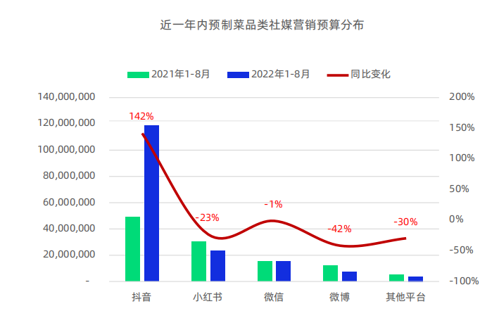 在消费端,由于2022年多家预制菜品牌企业一直在借助直播、私域流量、达人种草、线下门店等加大对预制菜的推广力度,这也让预制菜在消费端的渗透率有所提高。比如,去年1-8月,预制菜在抖音的营销预算较2021年同期直接提高140%。