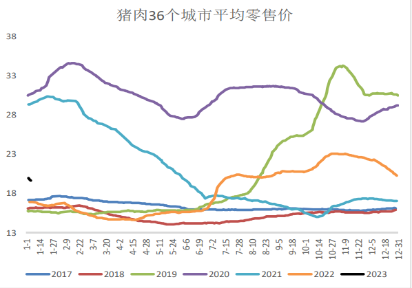 另外,从去年12月份至今,在猪企去产能加大市场投放力度,以及下游需求相对缓慢的共同影响下,全国猪肉价格仍在震荡偏弱运行。以1月5号为例,全国36个城市猪肉零售价从19.61元/斤,较一周前价格跌0.65元/斤。