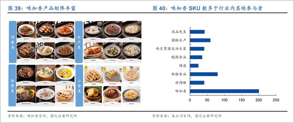其中味知香以肉禽类预制菜为主,SKU数量众多是其一大优势,2020年就接近200个,远超同期安井冻品先生、国联水产等品牌。