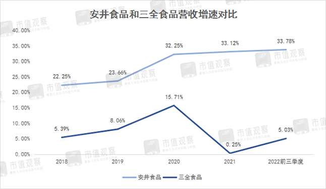 安井自2018年以来营收增速都在20%以上,2020和2021年增速超30%;而三全在2018年增速就已经放缓至个位数,2020年由于疫情催化,增速才提升到15.71%,2021年增速再次放缓至0.25%。