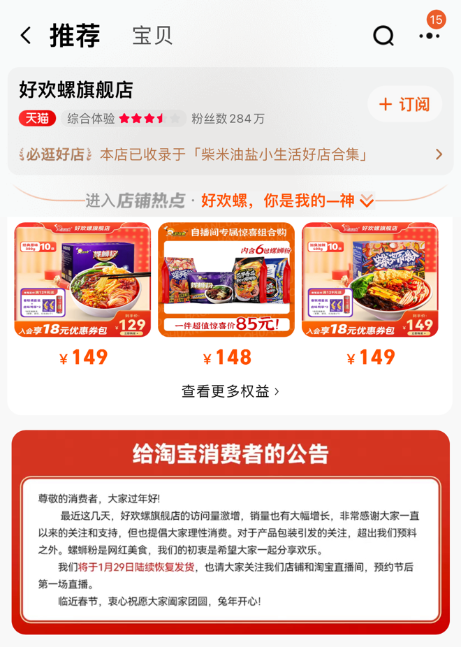 这一纸看似简单的公告,却直接登上了热搜,有力回击了之前的传言。类似的案例还有今年年初爆火的好欢螺(主要售卖螺蛳粉)。