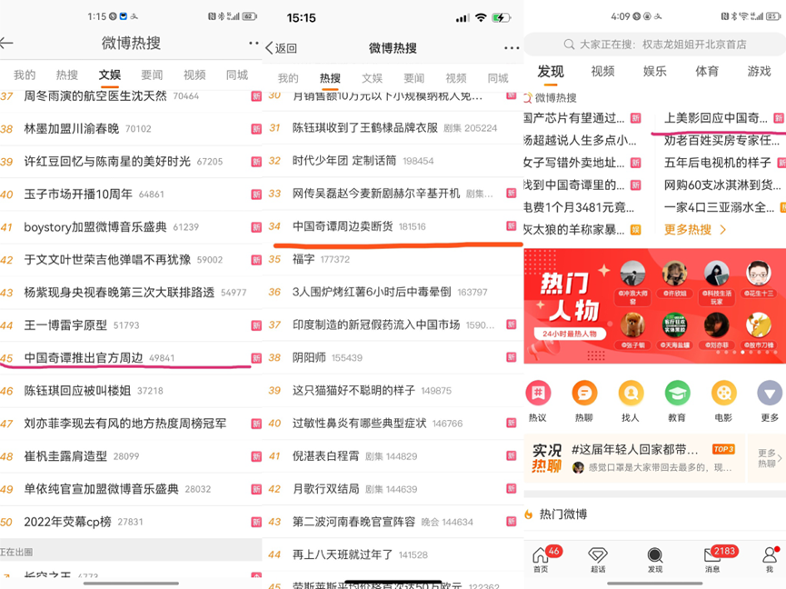 在#中国奇谭推出官方周边#和#中国奇谭周边卖断货#话题登上微博热搜后,#上美影回应中国奇谭周边脱销#也相继冲上热搜。