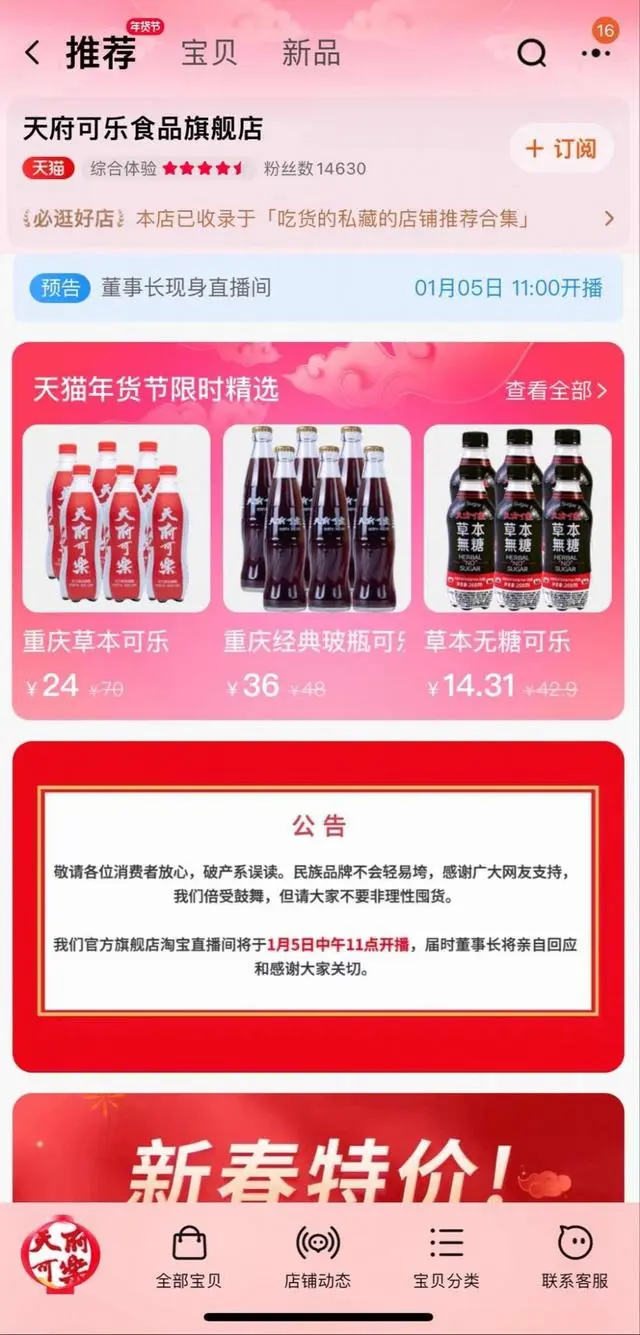 再比如,之前一则关于天府可乐破产清算的传闻登上了热搜。大众在为这一民族品牌惋惜的同时,还来到了天府可乐食品天猫旗舰店下单囤货。眼看着就闹出了一个“乌龙”,天府可乐也马上在天猫旗舰店内发布公告,澄清谣言,并预告“董事长将来淘宝直播”。
