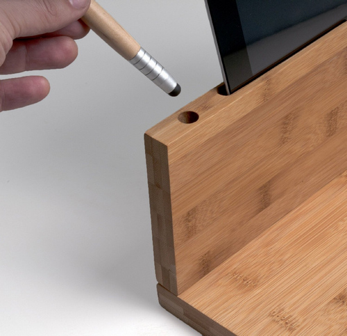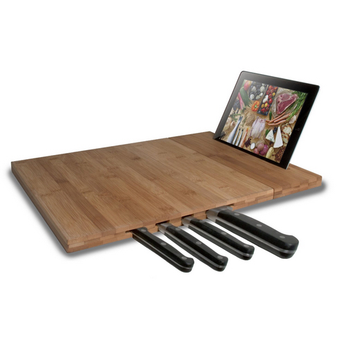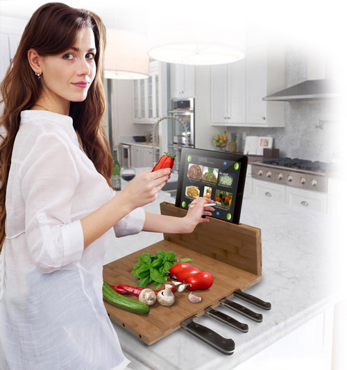 如今越来越多的人开始一边用 iPad 看食谱看视频一边烧菜做饭,CTA Digital 由此设计了一款特制的砧板。它设有两个可放置 iPad 的开口,这样既能在砧板平放时使用,也可以立起来以支架形式使用,同时它还贴心的配了一支触控笔,这样可以避免烧菜时弄脏的手去弄脏屏幕。此外,砧板中间有多个不同规格的开口,可用来插放刀具。