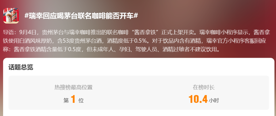 瑞幸全国门店数已经破万,稳坐咖啡赛道头把交椅。茅台的地位更不必说,两者联名亦是强强联合,同样也极具反差感。虽然咖啡加酒并不算新鲜事物,但“这可是茅台,不是一般的酒”。