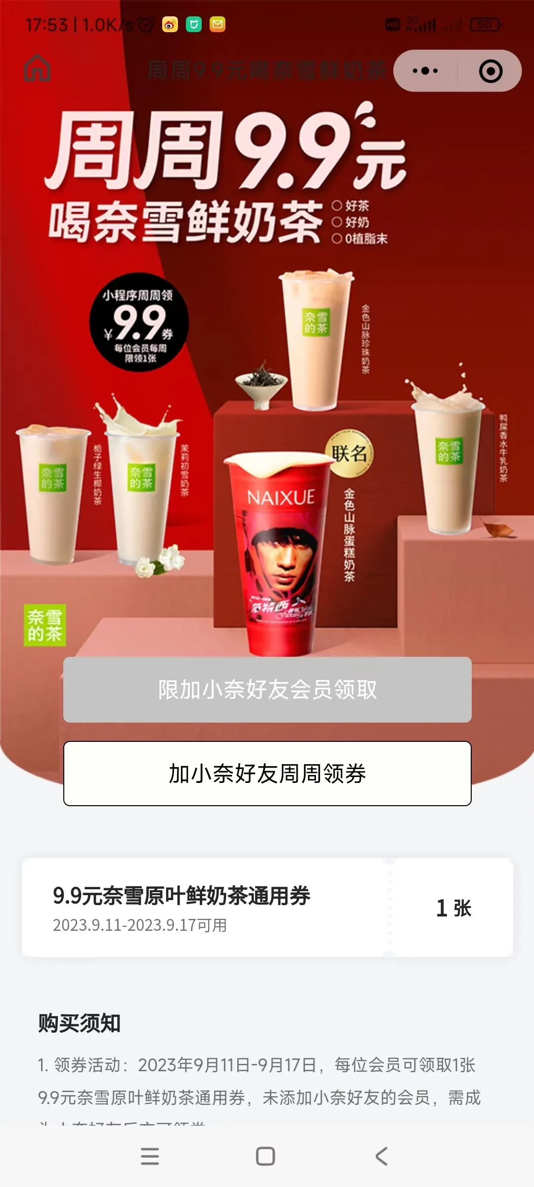 当然,奈雪绝对不会错过借机重推单品的机会。据《证券日报》,奈雪在联名同期推出了“周周9.9元喝奈雪鲜奶茶”的活动,只需要加对应地区客服的企业微信领券,就可以9.9元喝到几款不同品种的水牛乳奶茶。据奈雪方面称,这项活动复购率近30%,转化相当可观。