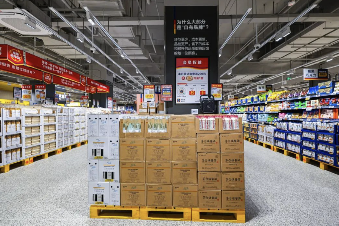《联商网》在无锡店现场看到,除了少量如白酒(五粮液、剑南春、汾酒、尖庄等)、方便面(白象、汤达人、辛拉面)、调味(海天、宝鼎、元宝、多力)、饮料(百事及可口可乐)、奶制品(光明)等知名大牌,现场几乎很难看到其他厂牌;相比上海金山大店开业,江苏首店从商品结构和自牌内涵上,有了更大程度的进化和丰富。