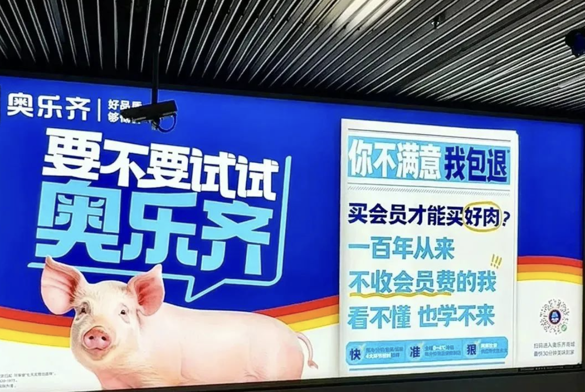 从最初在上海主要地铁线的立柱上放置的大白菜、可颂面包、牛奶、胡萝卜等巨型模型,到邀请《情深深雨濛濛》中雪姨的扮演者王琳代言,通过“姨姨严选”活动输出和品牌相关金句及表情包,再到与上海永久牌自行车进行“消费满299元即可用9.9元换购自行车”联名活动、携手沪上网红花店王尔德在沪举行“每日限量赠送春鲜蔬菜花束”活动,再到“不输大牌试试奥乐齐悠白”“买会员才能买好肉?买肉还在挑花眼?买肉就像开盲盒?要不要试试奥乐齐!”,后来“9.9元的超值浓香型纯粮52度白酒”“99元一箱红酒”“99.9元的500毫升茅台镇酱香型53度白酒”等等单品,出圈营销比比皆是。