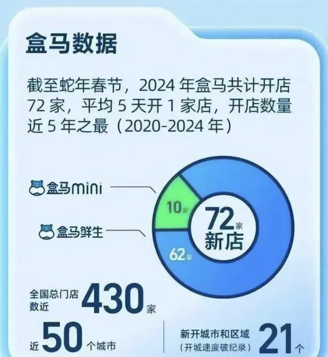 去年一年里,盒马总共开出了72家门店,盒马鲜生大店总数达到430家,超过沃尔玛中国的门店。