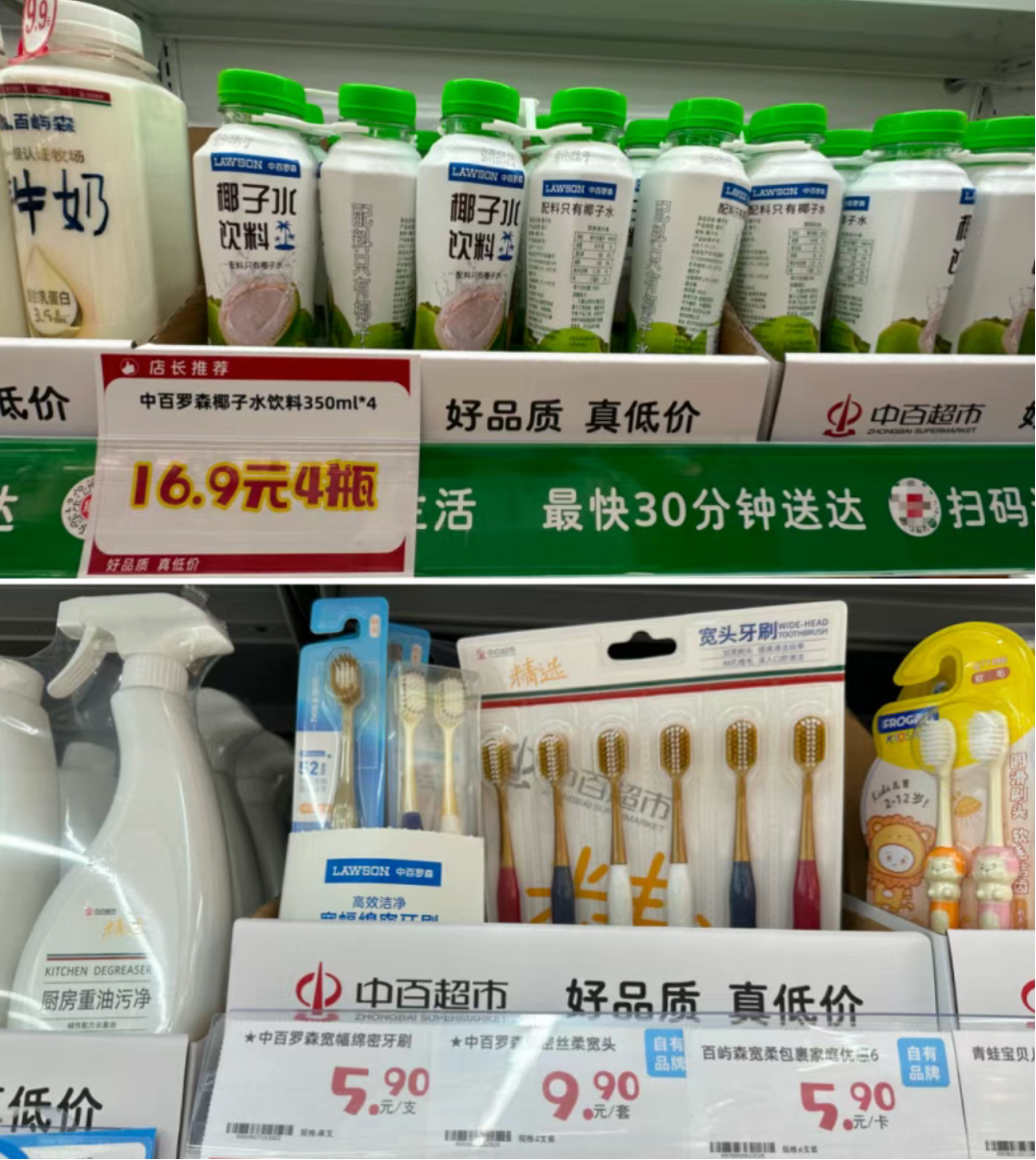 因此,我们能够在中百超市硬折扣店内看到多款“中百罗森”商品。如中百罗森椰子水饮料350ml售价16.9元4瓶,中百罗森宽幅棉密丝柔宽头牙刷5.9元/支等。