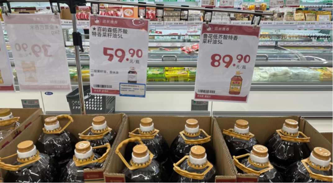 陈列技巧上,将自有品牌与一线品牌比邻陈列,如59.9元/瓶的“百屿森”5L菜籽油紧邻89.9元/瓶的鲁花同类型产品,形成直观价格对比。