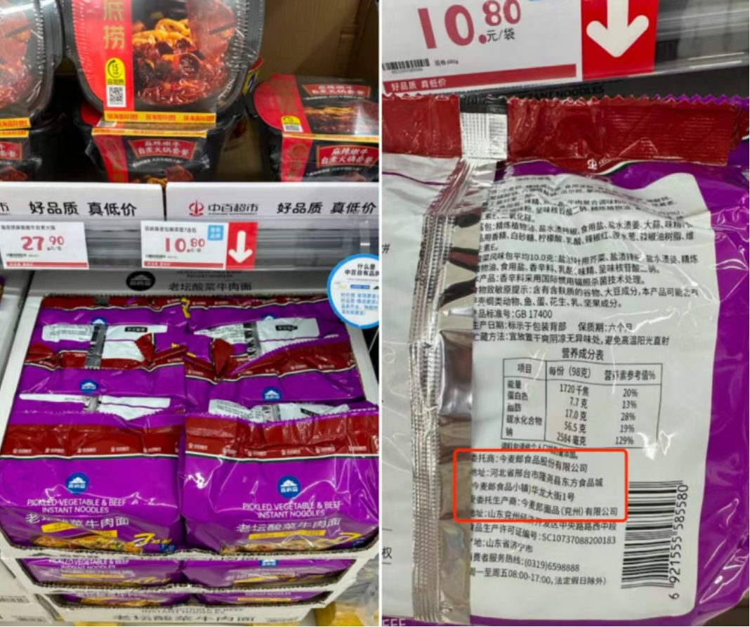 再比如,将“百屿森”红烧牛肉面(今麦郎代工)7连包仅10.8元/袋,陈列在海底捞27.9元/盒的麻辣嫩牛自煮火锅旁,直击价格敏感型消费者。