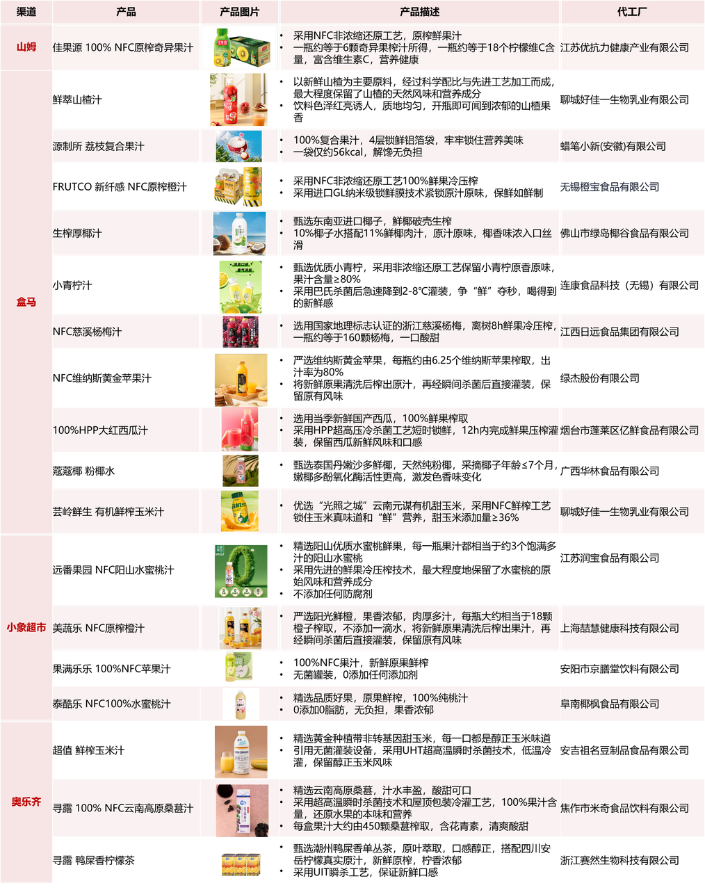 公司拥有多个鲜果种植合作基地,并配套整条水果的分选及深加工系统,可实现从原果到多样化的产品形式,包括果肉颗粒型产品、鲜榨果汁、饮料浓浆、蛋白饮料、茶饮料。合作伙伴包括盒马、沪上阿姨、东方甄选等。