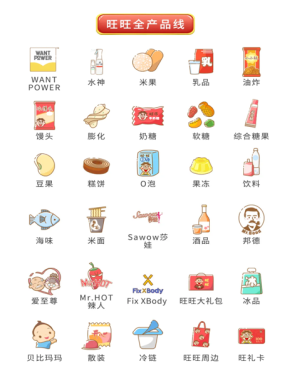 旺旺集团自1962年创立于台湾宜兰,如今已发展成拥有34家独立分公司、420家营业所的行业巨头,销售网络覆盖全国并延伸至全球66个国家和地区。经过60余年的发展,创造了旺旺雪饼、旺旺仙贝、旺仔牛奶等家喻户晓的产品。在拥有成熟产品线的同时,积极拓展莎娃Sawow(低度酒饮)、邦德先生(咖啡品牌)等新锐品牌。