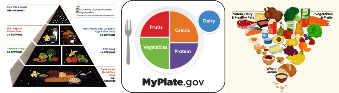 首先,新版指南颠覆了美国沿用了十多年的膳食模型。如果把时间拉长,美国的膳食逻辑,其实经历了三次重要变化。