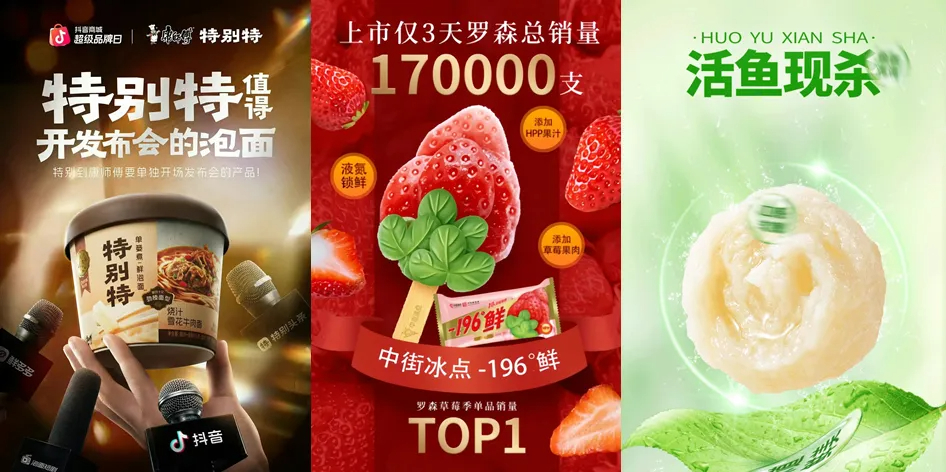 康师傅特别特鲜泡面,三天销量破10万;中街-196鲜冰淇淋,3天爆卖17万支;安井的活鱼现杀嫩鱼丸,八个月带来近8000万营收……