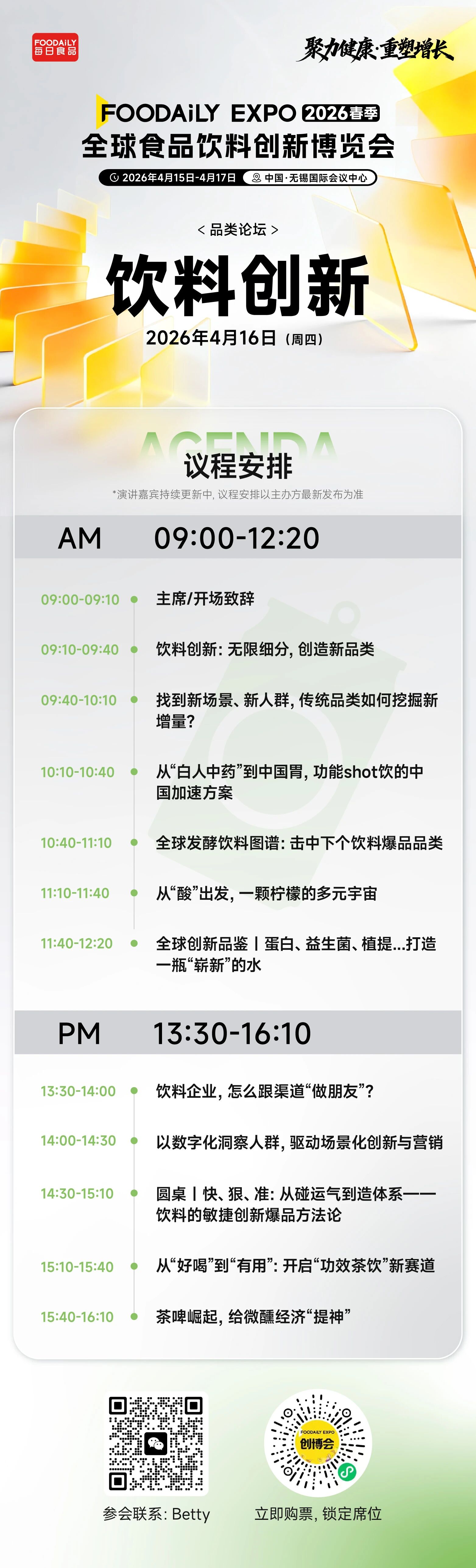 以「聚力健康 · 重塑增长」为主题,2026 Foodaily全球食品饮料创新博览会将于2026年4月15日-17日,在中国·无锡国际会议中心举行。其中「饮料创新」品类分论坛中,我们将深入洞察那些正塑造市场格局的潜力品类与创新机制,与众多品牌一同探讨如何在高度内卷的竞争中,寻找一条清晰的差异化增长路径。