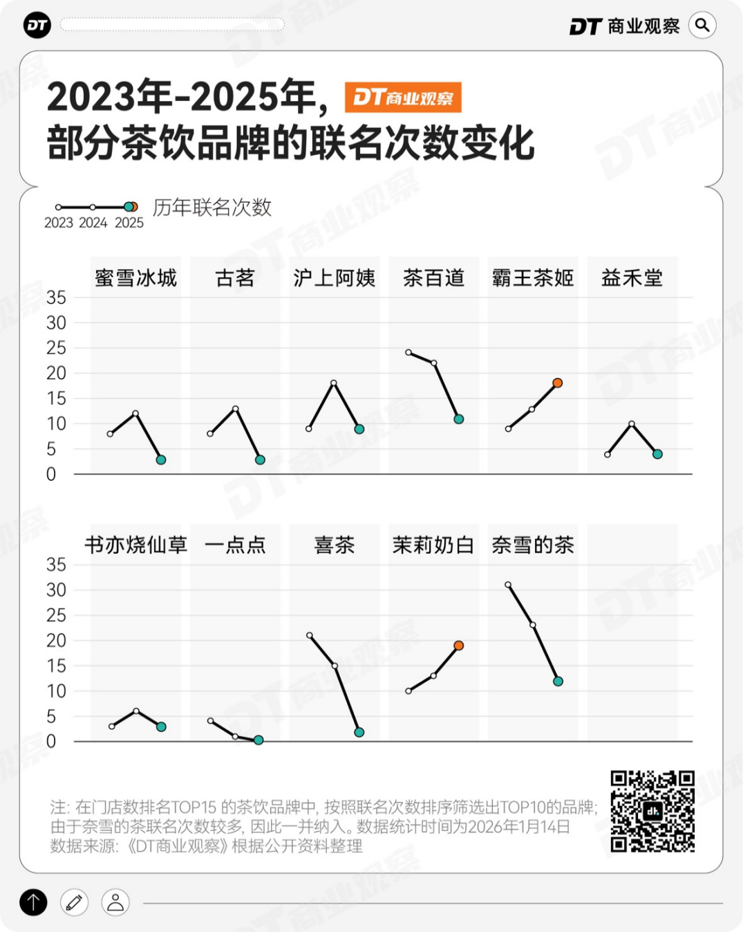 《DT商业观察》统计发现,2024年,门店规模TOP10的茶饮品牌中,有7个品牌增加了联名次数(相比2023年),但2025年,则有8个品牌减少了联名,其中联名鼻祖喜茶只有2次。而在咖啡品牌中,似乎只有瑞幸仍在持续用联名刷新存在感。