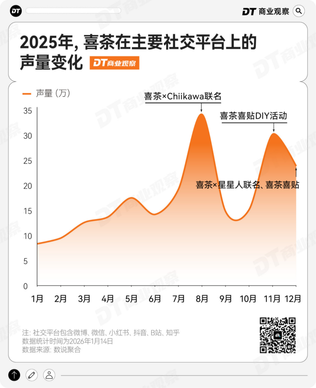 正因如此,茶饮品牌在营销和产品上的差异化,成了品牌保持核心竞争力的关键。通过分析喜茶2025年的社媒声量峰值变化,《DT商业观察》也发现,联名并不是提高品牌势能的唯一方式,DIY喜贴这样的创新玩法也能吸引大量关注。
