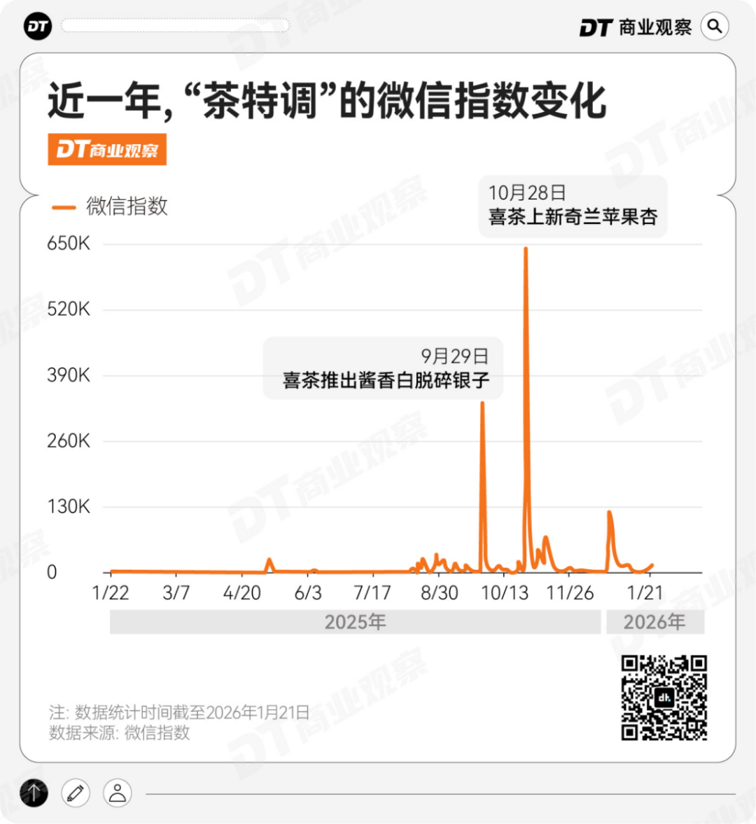 从微信指数来看,近一年,伴随喜茶在2025年9月和10月底推出了“酱香白脱碎银子“和“奇兰苹果杏”产品,“茶特调”的声量得到同步上升,达到了全年的两个小高峰。
