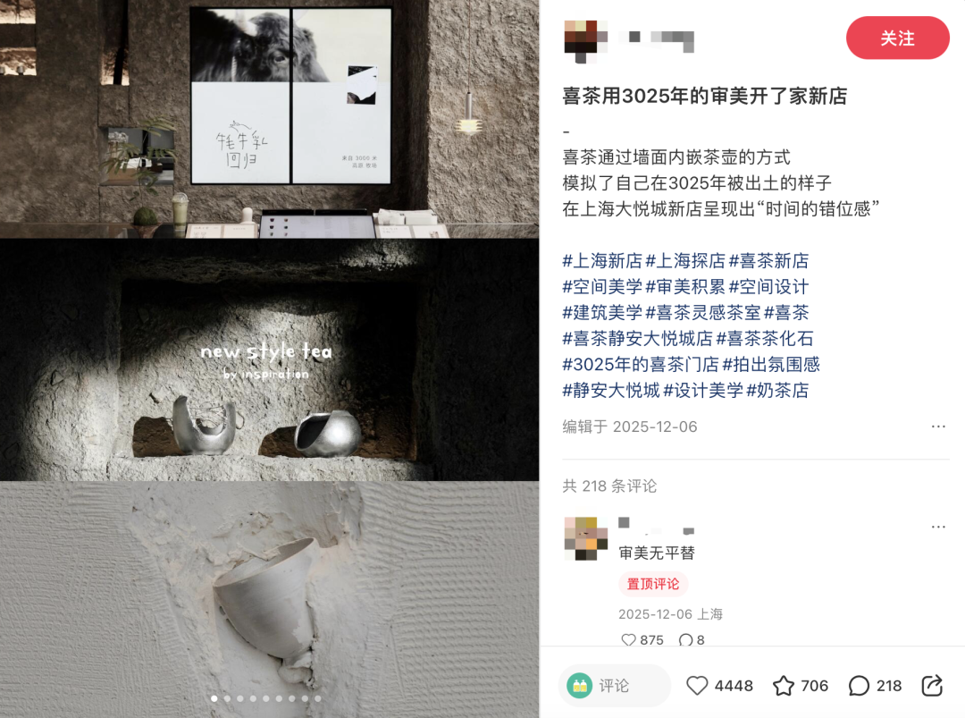 在杭州,喜茶在门店内打造了一座“纸上茶室”装置,用纸元素设计,来展现杭州“文人墨客的诗意感”。在上海,喜茶门店变成了一处“来自3025年的茶文化考古现场”,超前审美引发了小红书用户的种草。