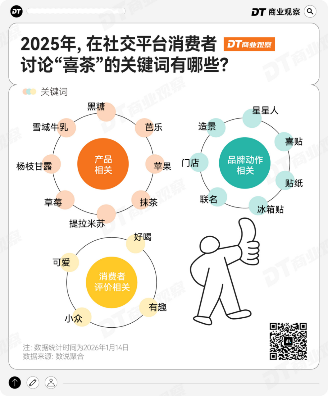 数说聚合显示,2025年大家对喜茶的关注除了集中在奇兰苹果杏等产品上,大家也看见了门店造景、联名、喜贴、贴纸等具体品牌动作。不仅可见度变高,人们对喜茶的印象,普遍与“好喝、有趣、可爱”紧密相关。