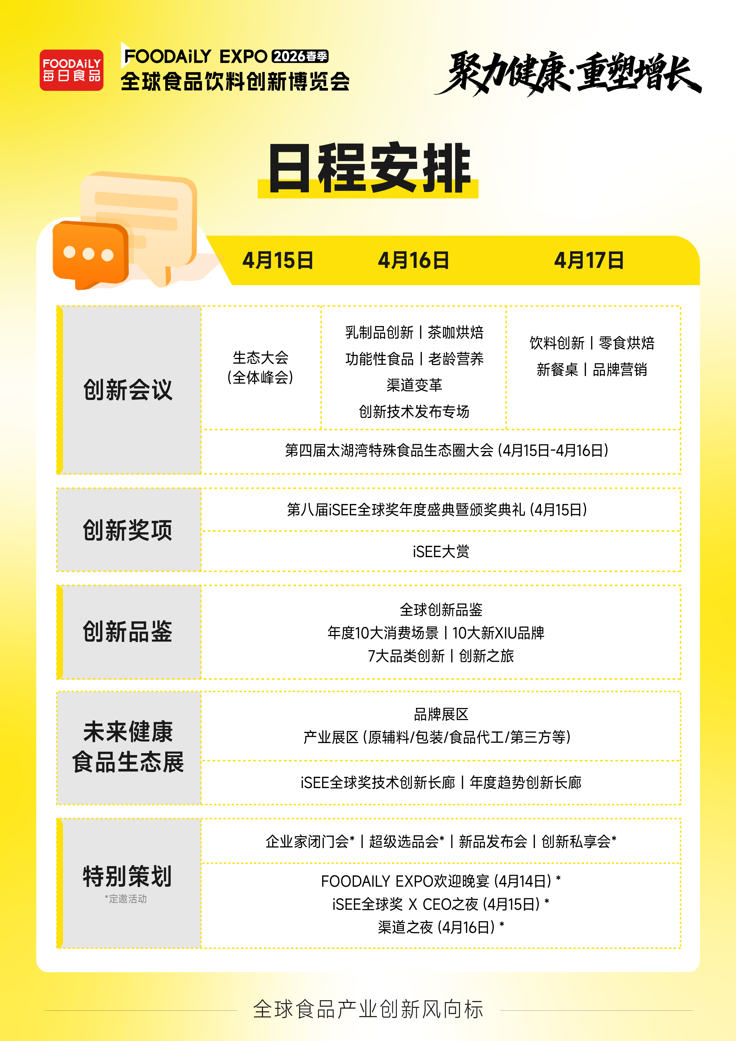 4月15日-17日,2026 Foodaily创新博览会将深度融合产业顶层思想、全球创新灵感与标杆品牌实践案例,以“创新会议+创新品鉴+创新奖项”以及“未来健康食品生态展”为核心载体,为参会者呈现全球视野下的食品健康化、功能化系统升级全景图。