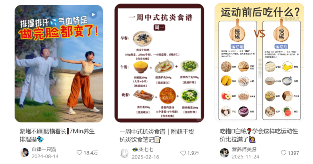 随着消费者决策逻辑的改变,他们还会更主动地筛选、比较、探讨健康生活的方式。在小红书、微博等社媒平台,健康食谱、养生操、运动饮食等健康内容比比皆是。