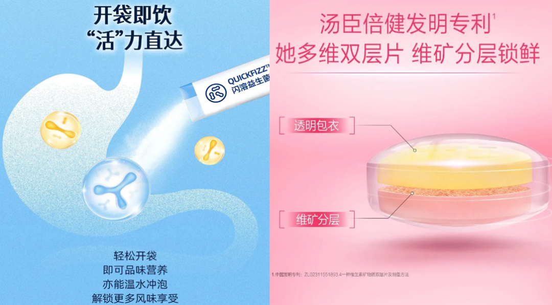 解码剂型趋势来看,一方面硬核科技纷涌而至:囊中囊的“双阶段释放”、维矿分层片的物理隔离、微囊化与晶球技术的活性保护;双舱饮、爆珠瓶盖、即混即饮等新剂型,让成分不再互相“打架”,递送更精准、稳定性更强、体内表现更可控。