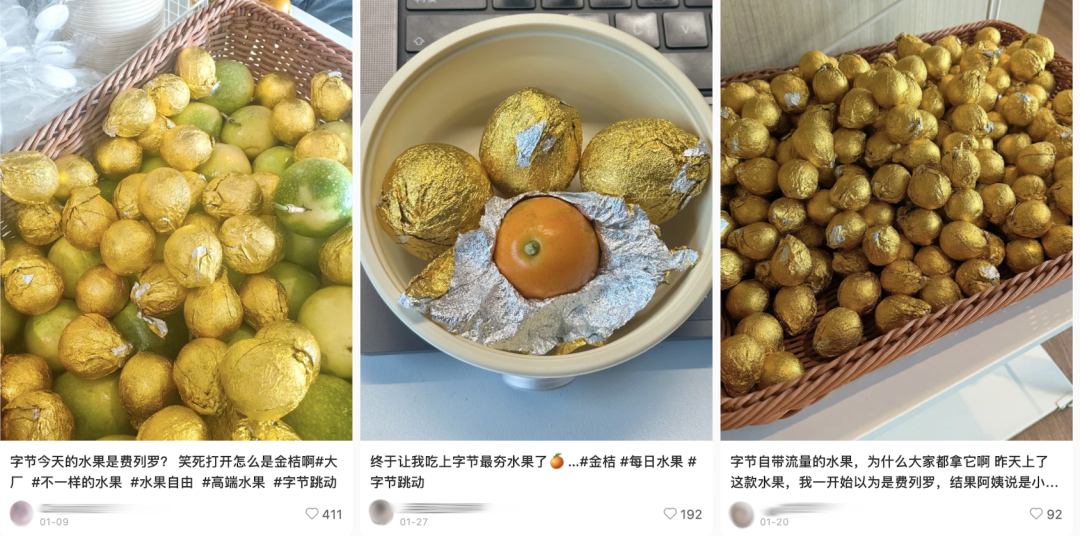 最近,字节同学们(字节打工人以同学自称)的下午茶在社交平台上火了。一颗颗金桔包裹着金光闪闪的金箔纸,最开始整齐地摆放在茶水间,不懂下午茶为啥要发巧克力的打工人转身选择了其他水果,回到工位却发现同事们都在赞赏这“巧克力”的美味。
