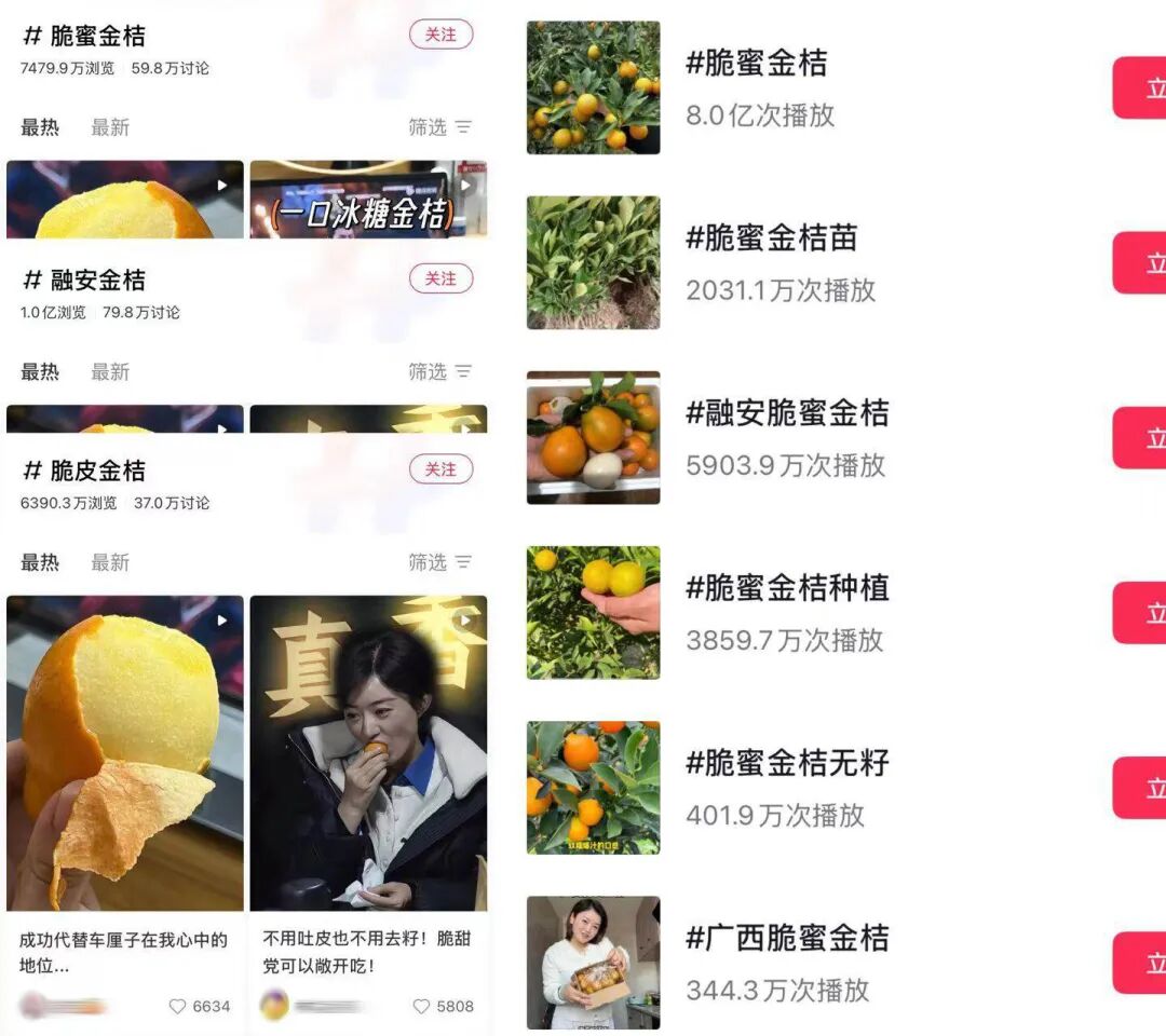 是金桔,或者更准确的说,是最近几年蹿红的产自广西融安的「脆蜜金桔」,相关词条在小红书上的讨论量上亿,抖音播放量超过8亿。
