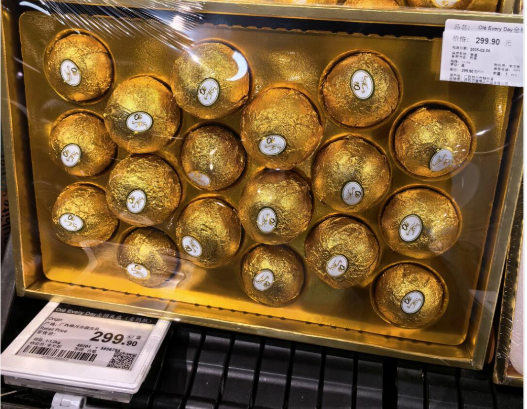 也就是说,不仅是拿下字节同学,甜王甚至拿下了全球嘴馋的中产。国内主要的售卖渠道是一众中产超市,山姆、盒马和Olé最近都上线了甜王,有的包装完全复刻费列罗,金纸包再装进金色盒子里,也有的把果子塞进礼盒里,每一个甜王都有自己的泡沫单间。