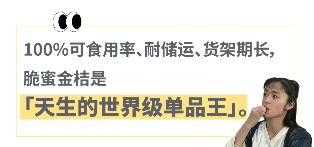 业内人士甚至称,脆蜜金桔是「天生的世界级单品王」,“100%可食用率、耐储运、货架期长,从品质、口感、颜值上来看都是一等一”。叮咚买菜瓜类商品采购负责人艾伟亚告诉氢商业,做好储存条件的话,脆蜜金桔最长可以在冷库放置一个月左右,而其他柑橘类水果一般只能存放不到两个星期。