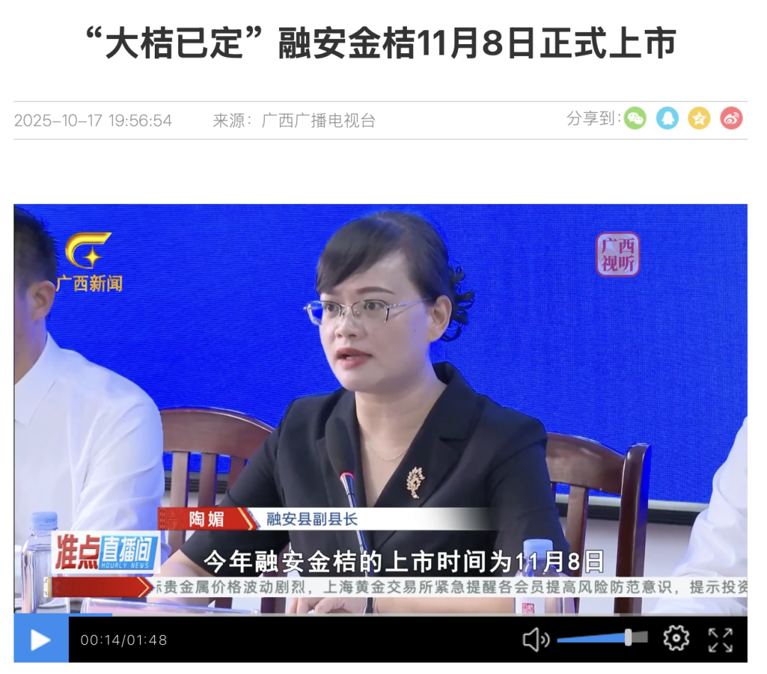 4.广西日报,《官宣|融安金桔11月8日起正式上市》,2025.10