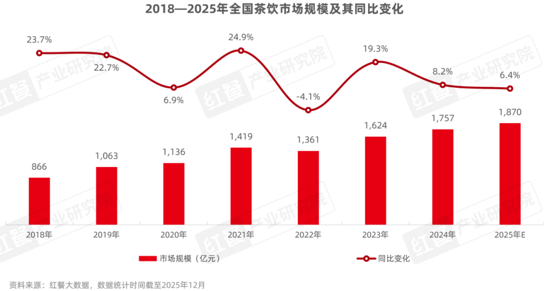 随着茶饮消费需求的持续释放,茶饮市场规模逐步增长。据红餐产业研究院测算,2025年全国茶饮市场规模预计同比增长6.4%,达到1,870亿元。