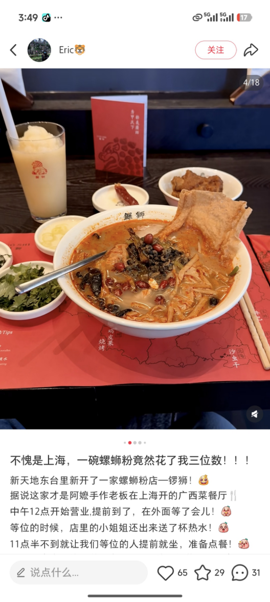 鑼獅彻底放弃了广西本地螺蛳粉的亲民路线,锚定中高端市场。一碗招牌螺蛳粉55元的定价,相较于市面普遍二三十元的价格,引发了广泛讨论。