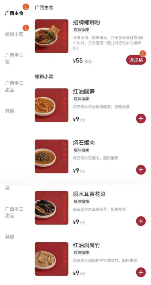 在产品架构上,鑼獅虽背靠源自广西的阿嬷手作,但并未局限于粉类,而是以“广西菜+螺蛳粉”为核心进行布局。螺蛳粉是招牌,但并非唯一主角。
