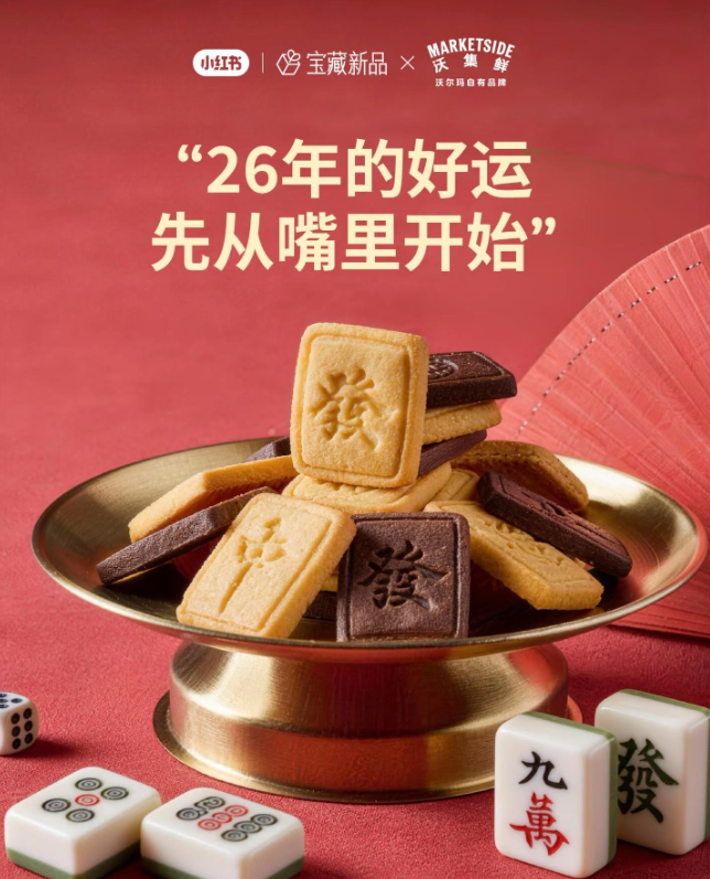 观察沃尔玛这批联名推出的19款商品,它们彻底跳脱了商超“功能优先”的逻辑,更具有精心设计的情绪属性。像是以“沃集鲜把把赢麻将曲奇”为例,49.9元一盒的饼干,被做成麻将造型且内含“天牌”,恰好击中国人春节“讨彩头”的心理期待。