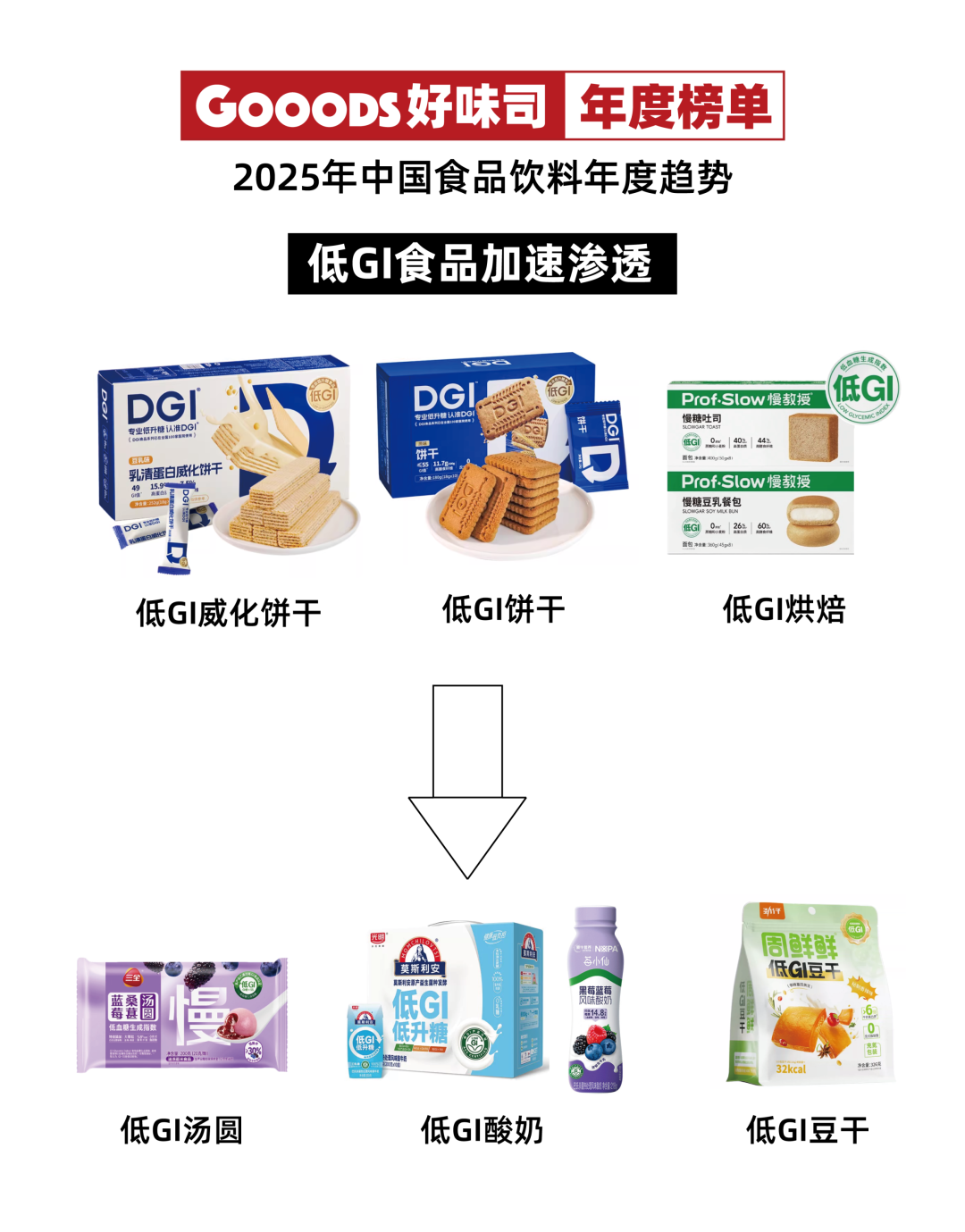 2025年,在品牌和渠道的共同作用下,低GI这一趋势显著拓宽了产品类型:低GI概念从饼干、烘焙延伸至更多品类,比如酸奶、果蔬汁、豆干、蜂蜜等,并通过认证标识,进入更主流的消费场景与人群。