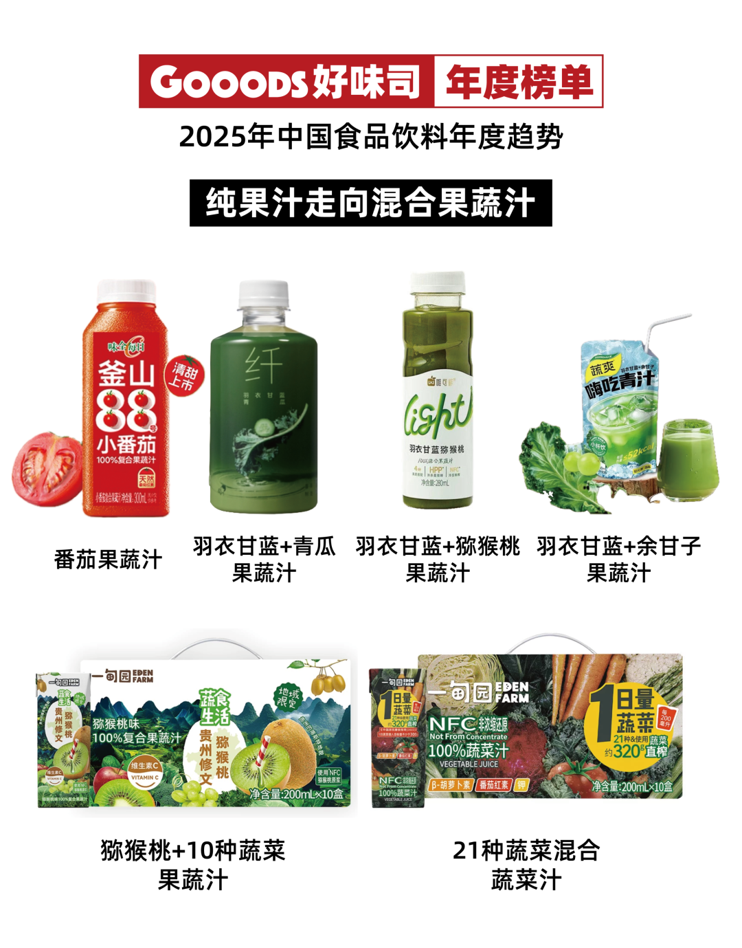一方面,地方特色果蔬,尤其是有较强营养价值、功能性的果蔬产品,在果汁工艺不断提升的情况下,借助果蔬汁产品,提供新鲜感和价值感;另一方面,果蔬汁也通过“超级食物”等概念和标签,进入更多渠道,吸引消费者在更多场景下饮用,比如健康补给、代餐、养生产品等等。