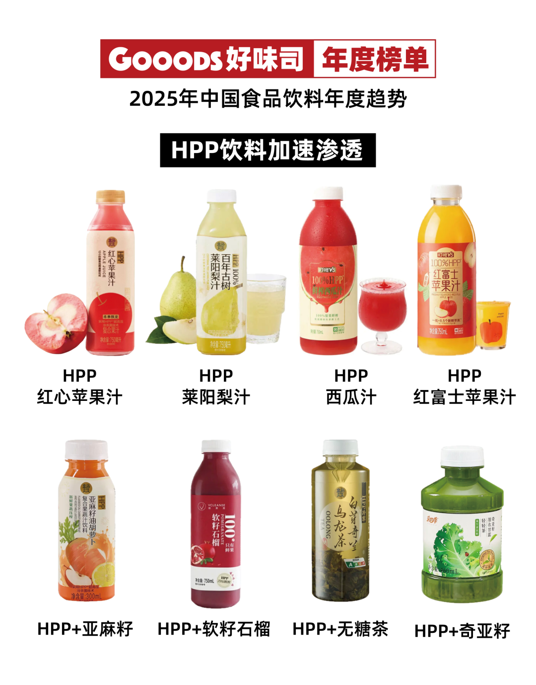 HPP技术是超高压冷杀菌技术,可以突破传统果汁热加工的局限性,更大程度地保留鲜果营养及风味,满足消费者对“新鲜”、“天然原味”与零添加的健康需求。HPP技术除了应用在常见水果之外,也拓展到一些特色水果(如西瓜、红心苹果)。