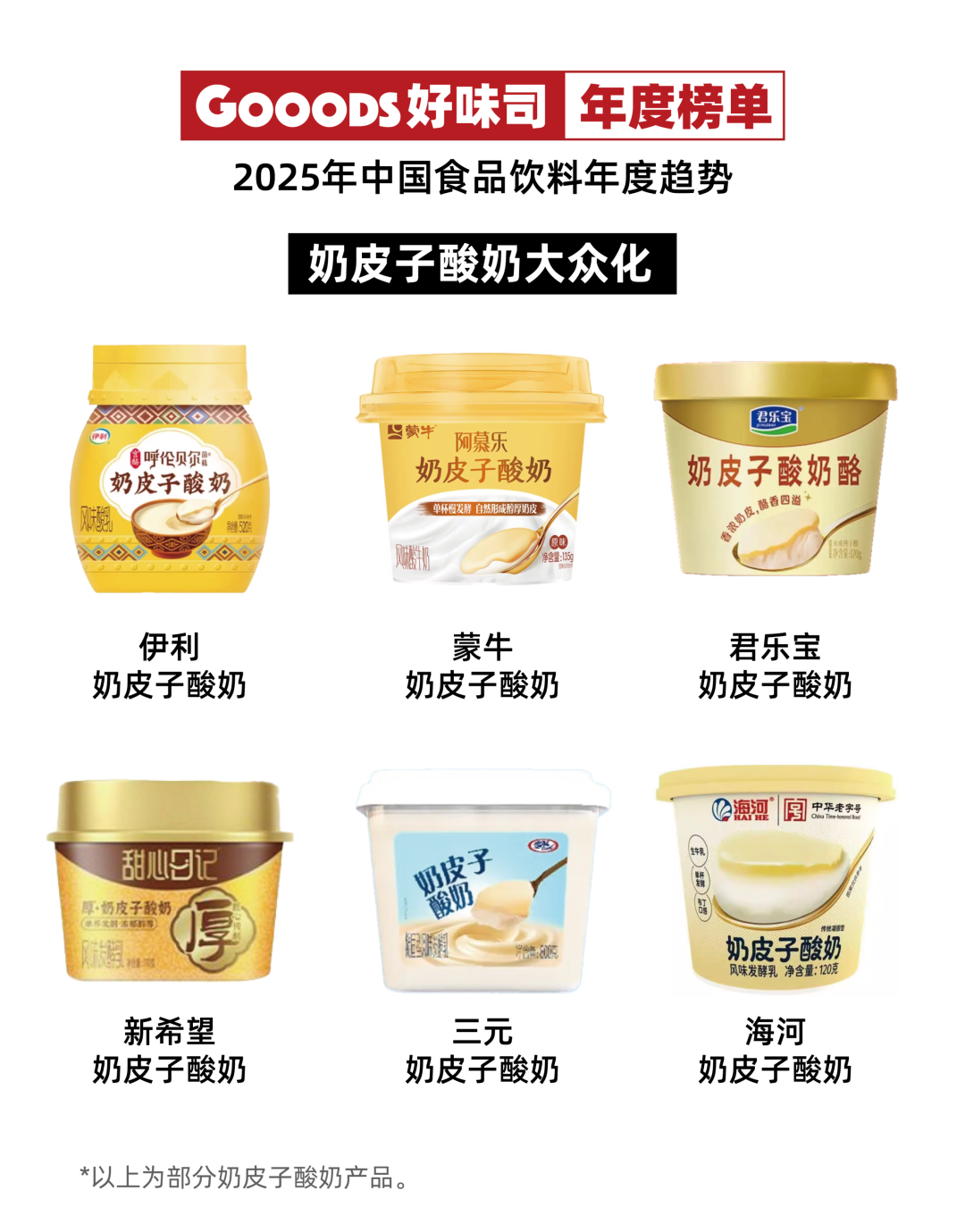 奶皮子酸奶是传统奶皮工艺与现代酸奶的融合,以“奶皮+酸奶”的双层口感体验(形似乳酪),将酸奶从健康食品延伸至"甜品替代品"赛道,从地域饮食走向了更大的消费市场,不仅在线下餐饮渠道效果显著,多家乳制品企业也跟进上新了这一产品,进一步打开奶皮子酸奶的市场潜力。