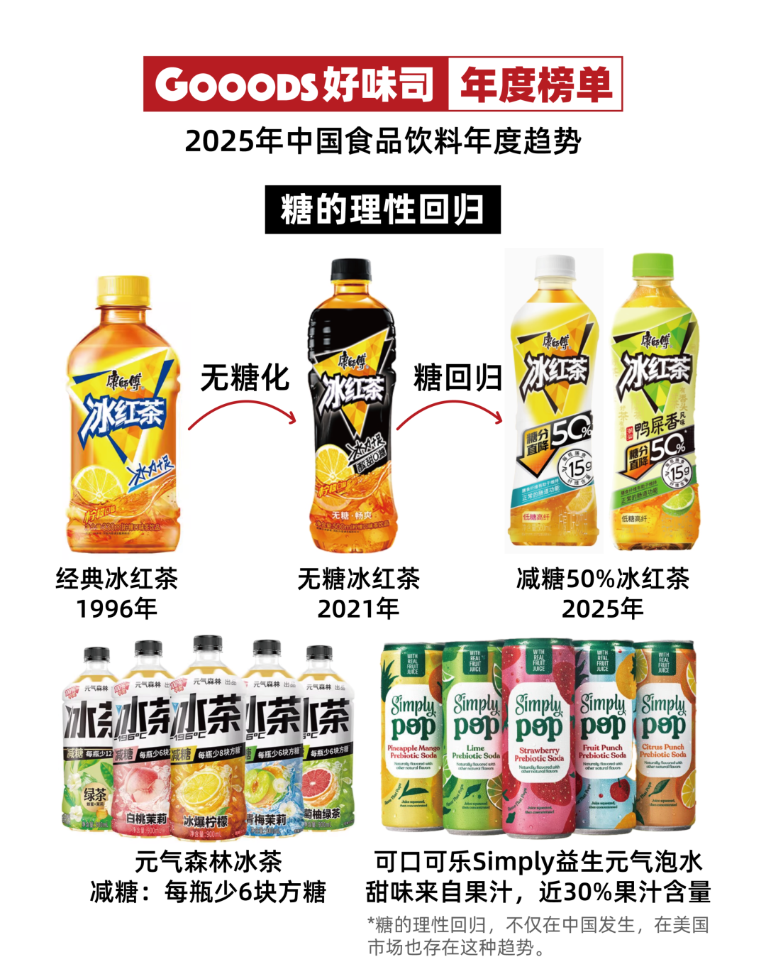 和前几年对于糖的一味拒绝不同,2025年糖在配料表中的使用回归到更理性的状态,产品开发不再一味追求无糖,而是更注重在“好喝”与“健康”之间找到最优解,尤其是要兼顾口味的平衡。