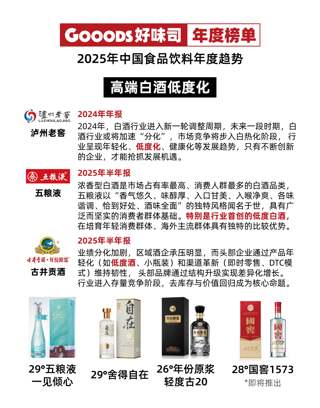 2025年,白酒的低度化开始形成行业共识,产品也从光瓶酒向中高端延伸。五粮液、洋河、古井贡酒、泸州老窖等头部酒企皆有所行动,推出中高端的低度白酒产品,五粮液甚至推出独立品牌:五粮液·一见倾心。
