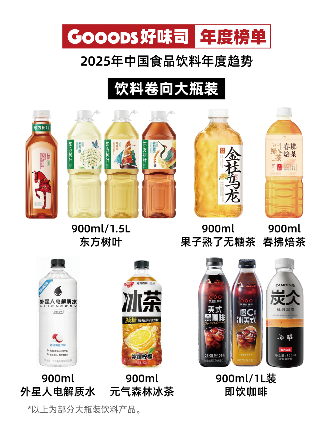 饮料产品在集体走向大瓶。从500ml到900ml,再到2025年的1.5L,这种“加量”的性价比策略,可以说席卷整个饮料行业。9.9元即饮黑咖啡市场热度持续提升,也受益于大瓶装策略。