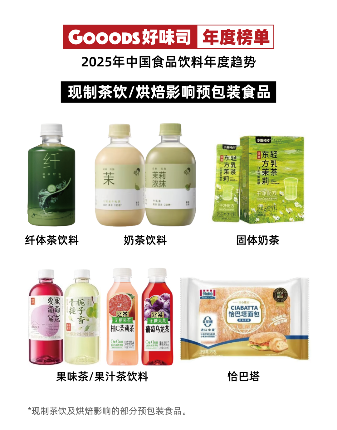 线下的餐饮,尤其是茶饮、烘焙,和预包装的食品之间,会有大量灵感借鉴。2025年我们看到这样的影响正在加速,线下饮品中的流行风味以及单品,正快速向预包装领域渗透,比如轻乳茶、果蔬汁、果汁茶、还有健康烘焙的代表恰巴塔等产品。