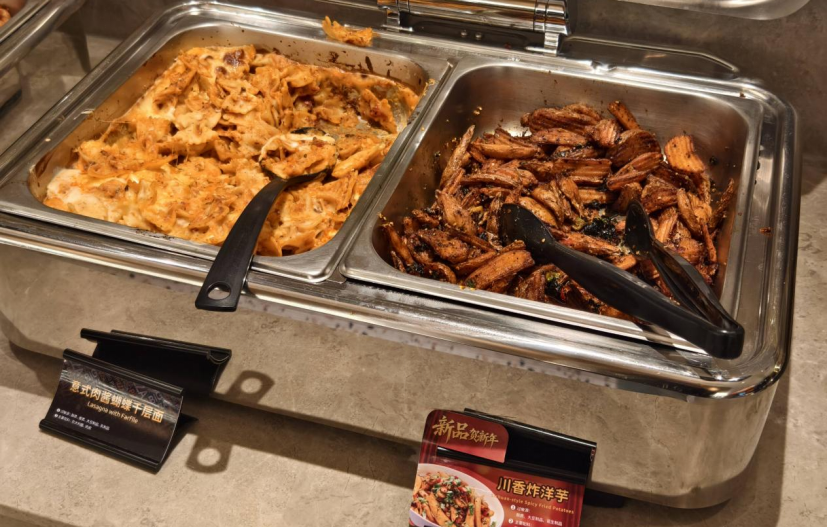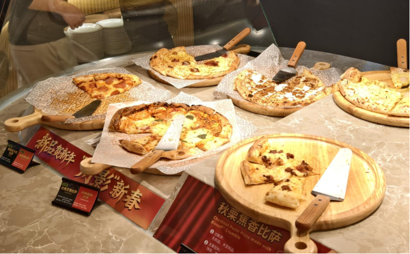 与此相似的是,记者前几天探访比格比萨发现,比格小食区的酱料选择,除了常见的甜辣、番茄、沙拉,还有贵州酸汤、罗望子等少见风味,主食区的新品是泰式冬阴功意面,意面旁又摆着日式寿司与中式凉菜、蒜蓉金针菇。