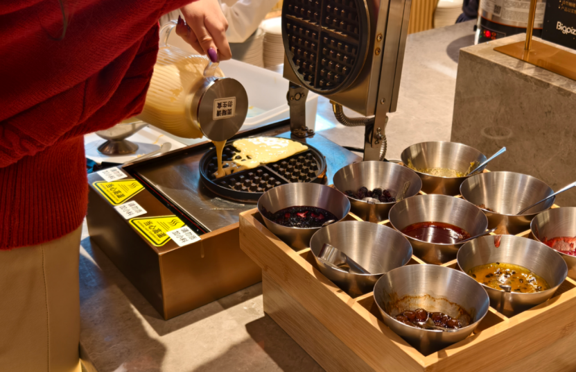 顾客在比格比萨店内DIY华夫饼。(图/新周刊记者拍摄)